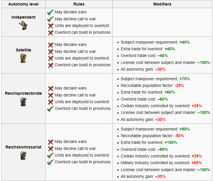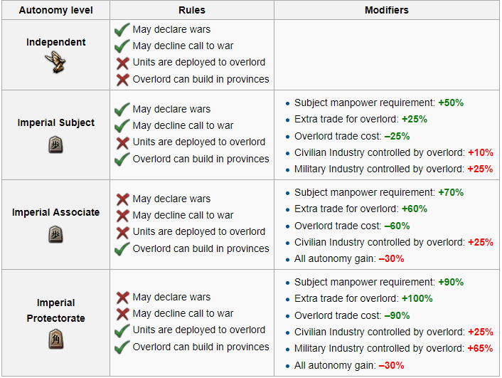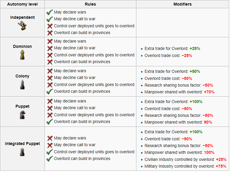 One puppet may act more or less independent than another. To represent the difference between largely autonomous dominions like Canada or Australia, somewhat autonomous colonies like the British Raj, and totally subservient puppet states like Malaya, the game divides subject states into four levels of autonomy. Within each level,